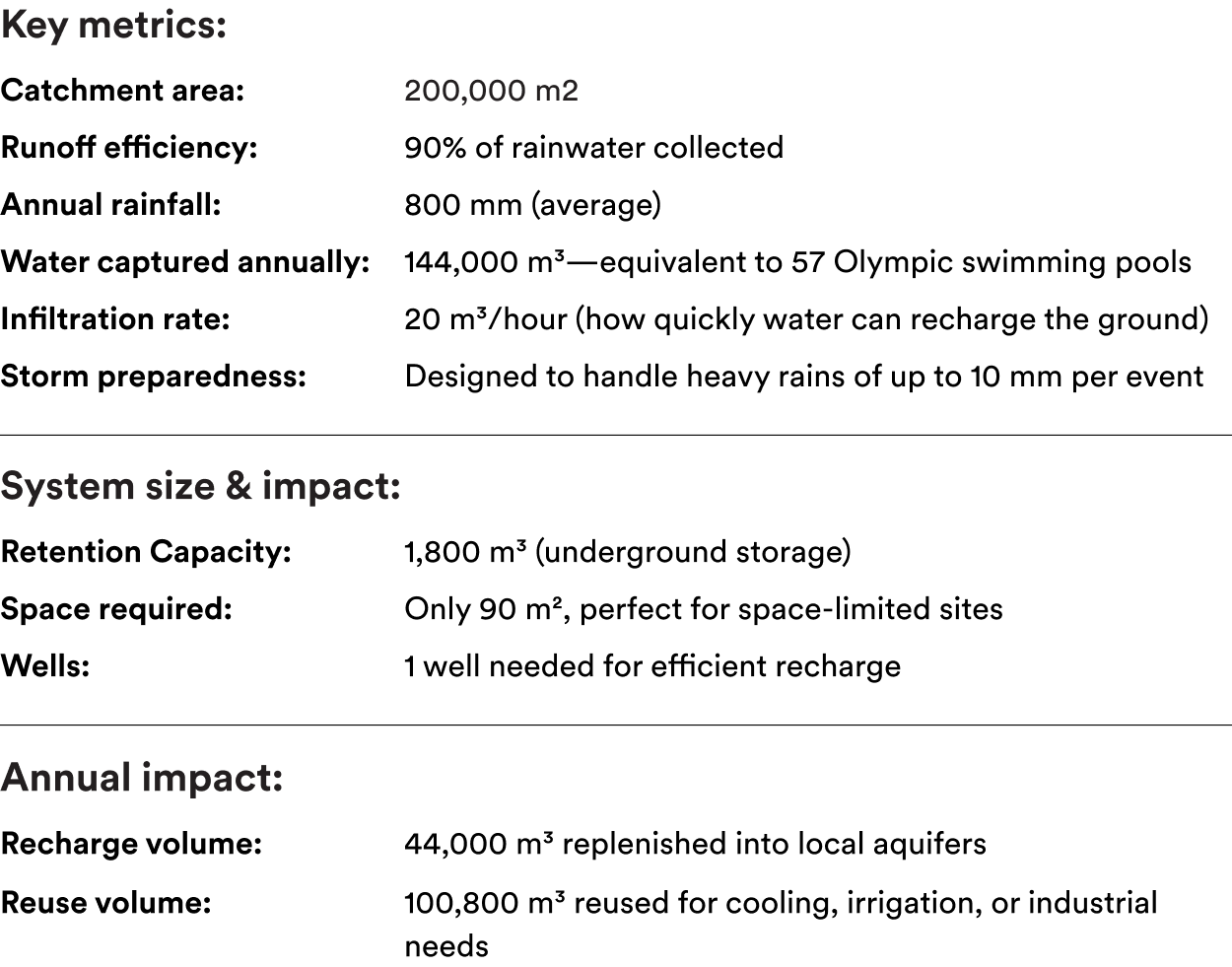 BlueBloqs collects and filters rainwater on-site, ensuring high-quality water suitable for aquifer storage and groundwater protection.