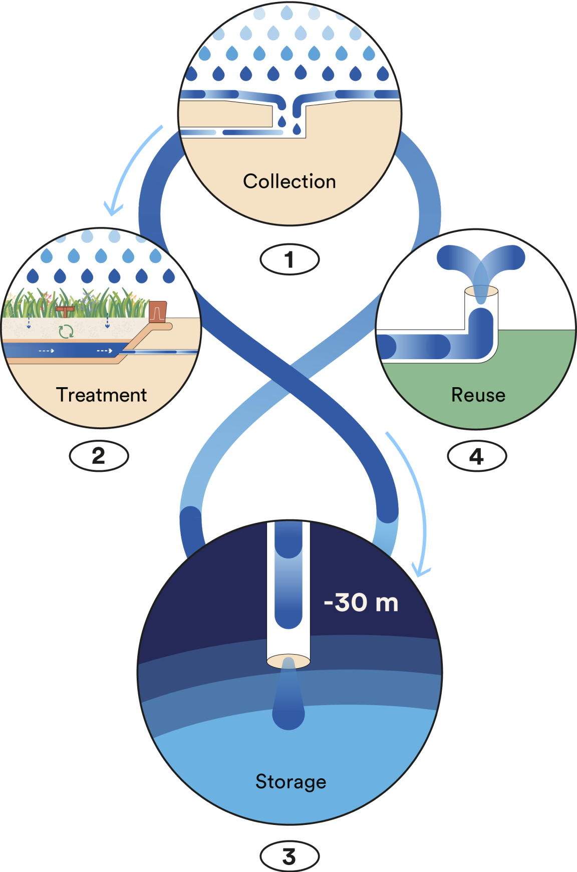 Our BlueBloqs systems integrate advanced water treatment with aquifer storage and reuse. This compact, efficient solution captures rainwater, treats it, and stores it underground—perfect for urban areas where space is limited but water issues are critical.